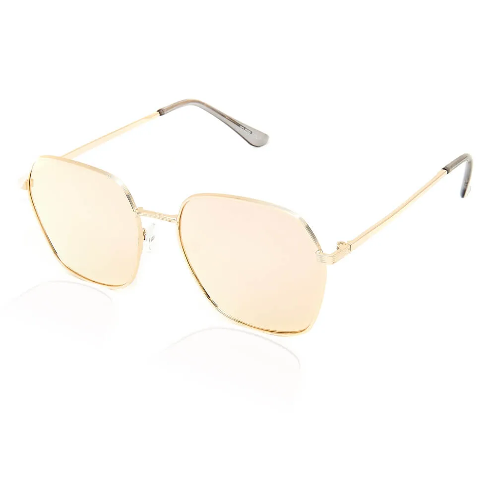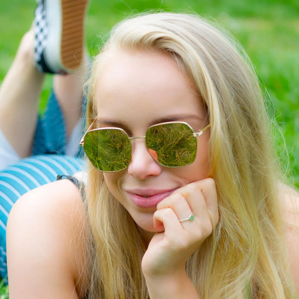 Deze zonnebril combineert een trendy design met 100% UV-bescherming, zodat je ogen niet alleen stijlvol maar ook veilig de zon tegemoet gaan. Het montuur is gemaakt van hoogwaardig metaal met een glanzende afwerking, wat zorgt voor een solide en duurzame bril die comfortabel op je neus zit. Met zijn categorie 3 UV-400 lens filtert hij schadelijke zonnestralen effectief weg, ideaal voor zonnige festivaldagen en zomerse wandelingen.